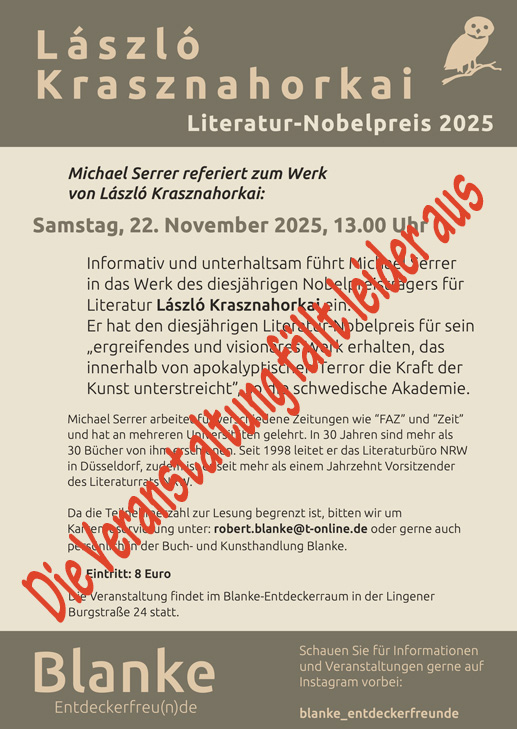 Michael Serrer wird im Blanke-Entdeckerraum informativ und unterhaltsam über László Krasznahorkai referieren.